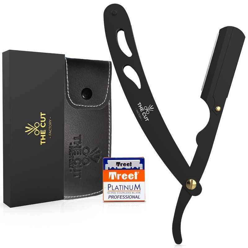 The Cut- Factory- Straight Razor with 100 Pack Platinum Treat Professional Barber Single Blade Edge Razors for Men for Close Shaving 100 Percent Stainless Steel-Black