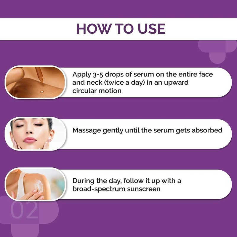 - How to Use: Apply 3-5 drops of serum to the entire face and neck (twice a day) in an upward circular motion. Massage gently until the serum gets absorbed. During the day, follow it up with a broad-spectrum sunscreen