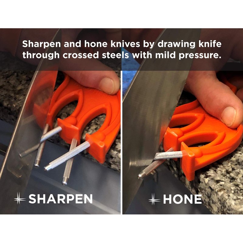 - HOW THEY WORK- All Edgemaker Tools work the same way. Simply draw the knife through the crossed steels with mild pressure. Read all Safety information before use