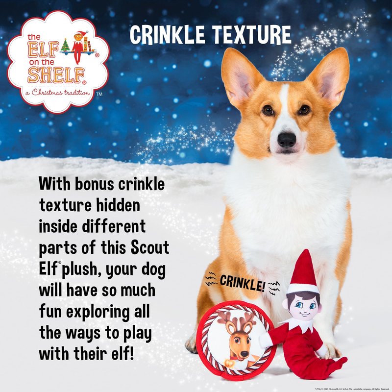 - CRINKLE TEXTURE – With bonus crinkle texture hidden inside different parts of this Scout Elf, your dog will have so much fun exploring all the ways to play with their elf!