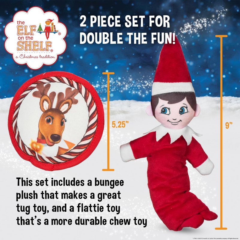 The Elf on the Shelf 2pc Dog Toy Set with Elastic Scout Elf + Elf Pets Reindeer Plush Flattie Disk, Squeaky Dog Toys | Bungee Dog Toys for Tug | Stocking Stuffers for Dogs