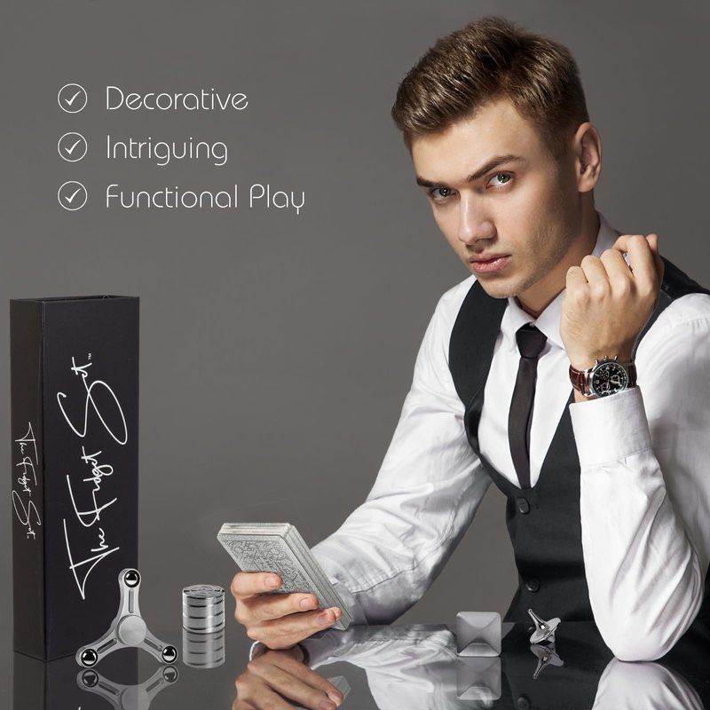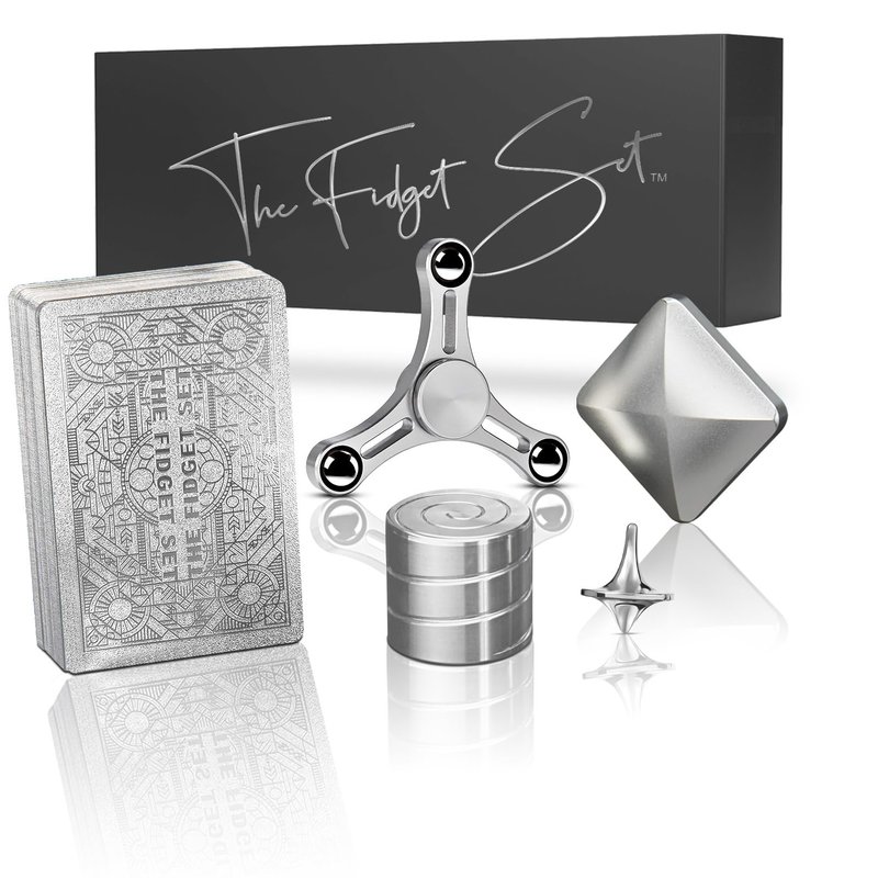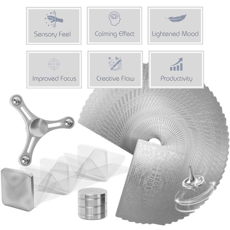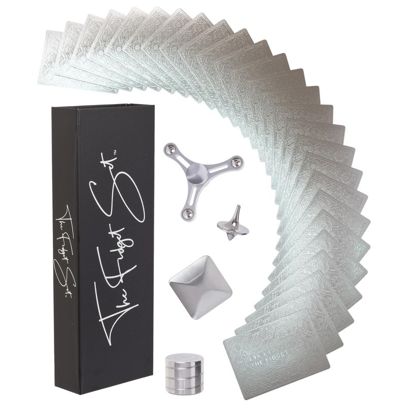 This exquisite Fidget Set of desk fidget toys for teens, adults, students and professionals contains toys machined of solid metal alloys, and a premium deck of cards made of corrosion resistant substrate, plated in metal. It makes the perfect ornament for the office desk, living room décor, or even the night stand. It is an exquisite adornment for the doctors office, lounges, and of course the therapist's coffee table. The Fidget Set Classic Edition is as interactive and intriguing as it is decorative, and would make the perfect gift for family, coworkers, loved ones, students, professionals of all kinds and foremost, the perfect gift for someone who has everything.
