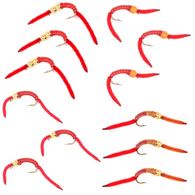 The Fly Fishing Place San Juan Worm Trout Fly Assortment Power Bead Worms 1 Dozen Wet Nymph Fly Fishing Flies - Hook Size 10-3 Each of 4 Patterns