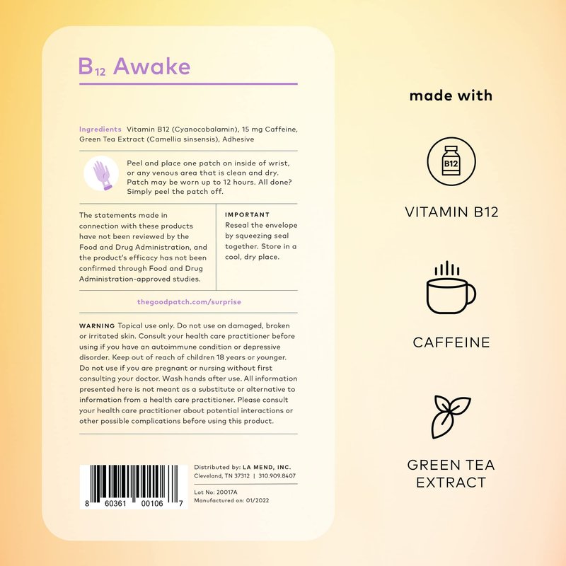 - CAFFEINE & VITAMIN B12: The B12 Awake Patch is perfect for the afternoon slump. Wake up with The Good Patch. Made with plant-based ingredients and formulated to give your day a boost. Contains 15 mg Caffeine, along with B12 and Green Tea Extract. We can all use a little extra boost!