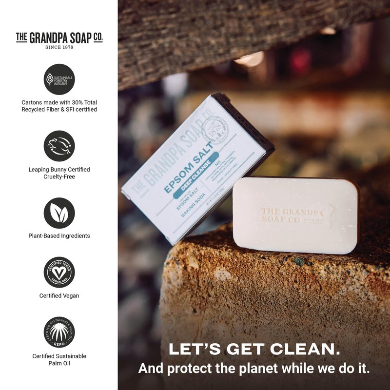 - PROUDLY CERTIFIED Our Epsom Salt Bar Soap is made with Certified Sustainable Palm Oil and is proudly certified Vegan and Cruelty Free. Sustainable Forest Initiative Certified packaging. The Grandpa Soap Company is Family Owned and Operated and Made in the USA.