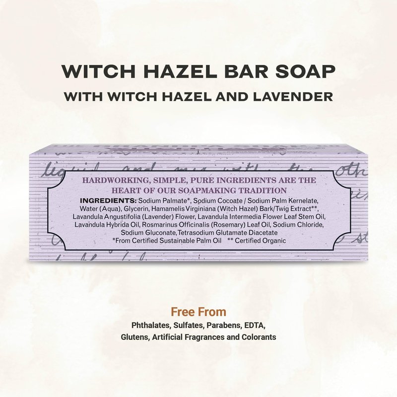 - WITCH HAZEL BAR SOAP A balanced blend of organic witch hazel and lavender offer an astringent cleaning formula that gently tones and rejuvenates. Its subtle earthy scent soothes, softened by delicate notes of fresh lavender.