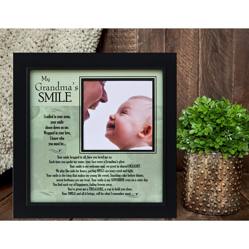 - Black classic wooden 8x8 photo frame that features a 4x4 photo opening for a picture of grandma and her grandchild. The “My Grandma’s Smile” poem is printed on an eye catching design that stands out from the competition.