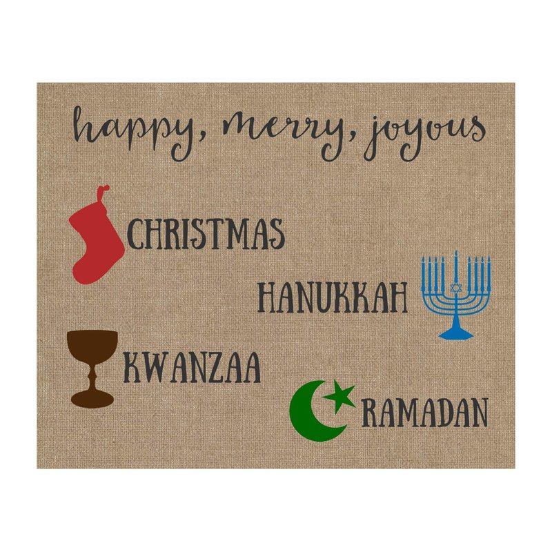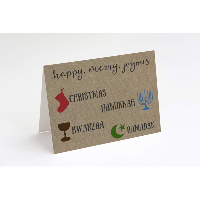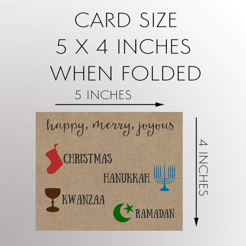 Wish a "Merry Everything" to all the special people in your life with this burlap-designed card that celebrates Christmas, Hanukkah, Kwanzaa, and Ramadan! Includes white envelopes. ♥ PLEASE NOTE: This design has a "printed effect" to look like burlap, but NO actual burlap is used in creating this product. ♥