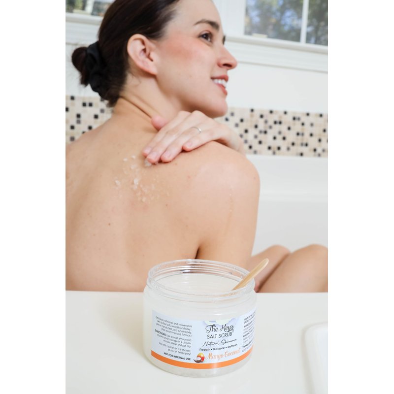 - GET ULTRA-SMOOTH SKIN FAST: This exfoliating body scrub made with Florida Key's sea salt scrub is perfect for your whole body. It's all-natural, chemical-free, and smells amazing, helping to regenerate your skin for improved texture and tone. The Mango Coconut body scrub deeply nourishes, leaving skin soft and smooth. Use it as a face scrub, pedicure foot scrub, or exfoliating body scrub for a complete spa experience. Keep it in your bath next to your soap for daily care.