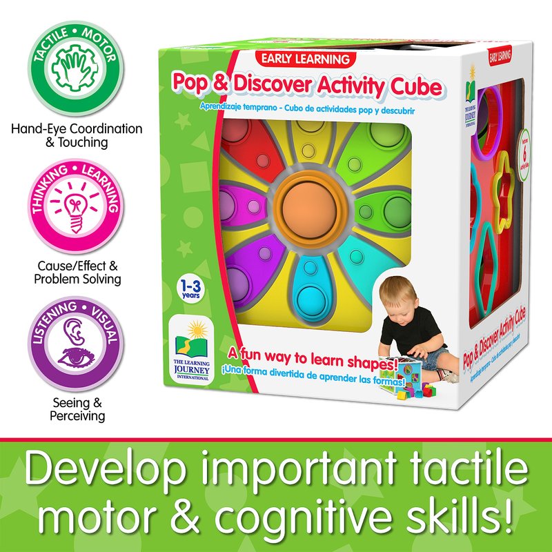 - KEY FEATURES – Includes two geometric shape sorter sides, two elastic band sides, and two bubble popper sides. The vibrant, eye-catching colors and various textures encourage children to explore and engage multiple senses while playing and learning. Parent-approved, an ideal choice for a holiday and a 1st birthday gift, which will put a big smile on their cute little face. Pop and Discover Activity Cube is a great developmental gift for both BOYS and GIRLS ages 12 months and up.