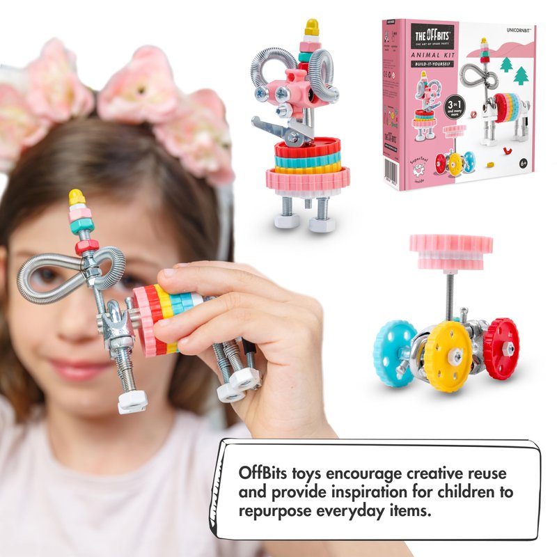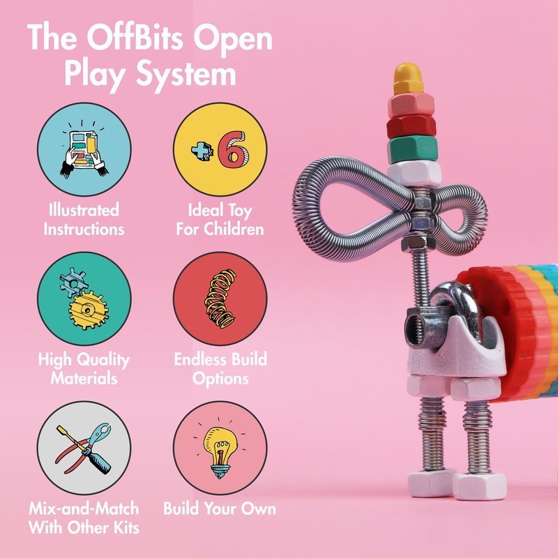 Introducing The OffBits, innovative and sustainable stem building toys changing the narrative around playtime. Our open-source construction system is based on build-it-yourself kits containing proprietary connectors and standard hardware components. Educating children on sustainability, these educational robot toys promote creative reuse and a low waste mindset for a brighter, more sustainable future. The OffBits Robot Character Kits allow you to build at least three out-of-the-box models. This robotics engineering kit and stem toy engineering toy foster STEAM learning, developing fine motor skills, spatial reasoning, problem-solving, and encouraging imaginative play. Each of The OffBits robots kit for kids include illustrated instructions manual, 5-in-1 supertool that makes it easy to screw together and take apart creations, and a unique registration code for our online community of creators where you can share your creations and get inspiration from fellow OffBits builders. Our kids building kit includes classic sets unicorn toys build your own robot kit build your own robots for kids build ur own robot kit for kids mini robot build a robot kit for kids 8-12 mini robots tiny robot robot spider toy off bits building toy erector sets for kids adult children gifts stem kits for girls age 8-10 stem building set the off bits build your own car kit offbits monkey robot build your own robot kit girls stem toys tiny robots off bits stem gifts for 8 year old boys penguin robot the offbits build your own robot kit for kids 10-12 robot building kit for kids 6-12 off bits robots mini erector set erector set for girls model robot build your own robot kits erector sets for girls stem space rainbow unicorn girls unicorn robot making connectors toys for kids count and build robot