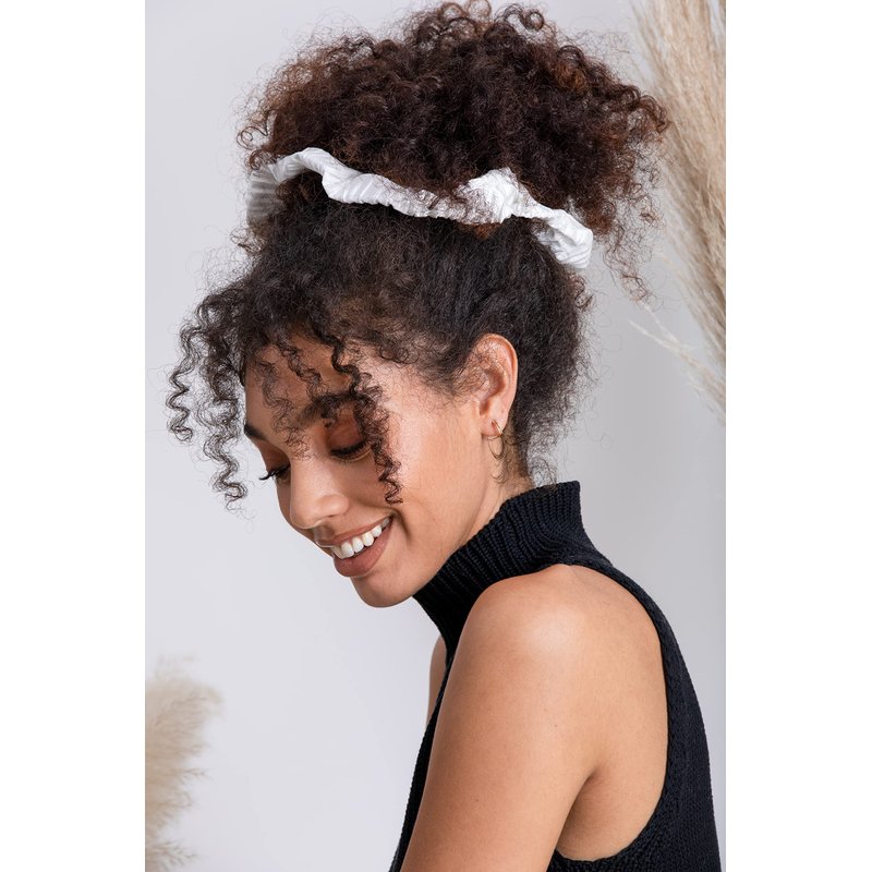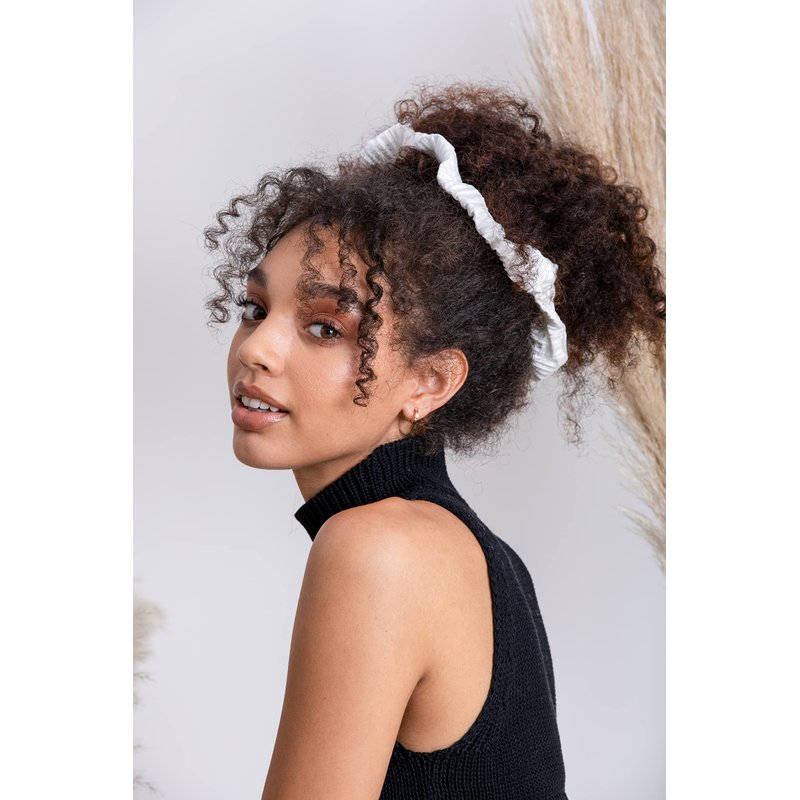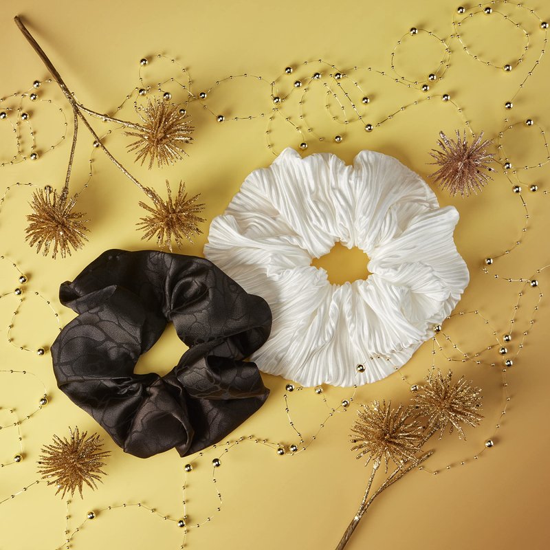 - 2 scrunchies—white pleated satin and black jacquard