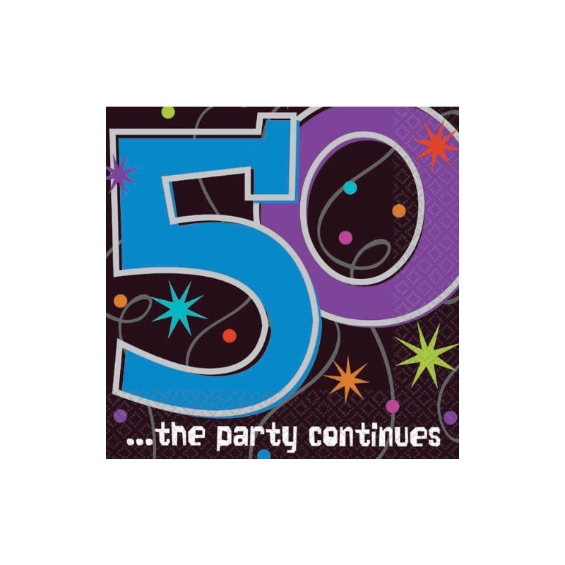 The Party Continues 50th Birthday Beverage Napkins are 5 inches square?the perfect size for passing out with drinks or snacks. They feature the colorful starburst and dot design on the theme along with the blue, purple, and white ?50 ? the party continues.? There are 16 napkins in each package.