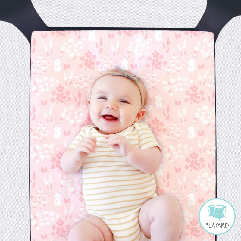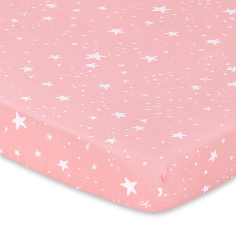 The whimsical woodland floral playard sheet set from The Peanutshell includes 3 unique allover prints in feminine shades of pink, tan and white. A sweet character toss with deer, owls, hedgehogs, trees, and flowers; tossed celestial stars; and a bunny floral meadow print make up this well-curated trio. The all-around elastic design ensures a safe and snug fit that's compatible with most standard playard mattresses. The fade-resistant material is quick-drying and machine washable, providing excellent quality and easy care at a great value.