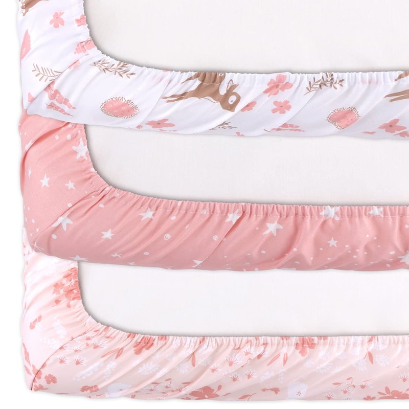 The Peanutshell Mini Crib Sheets Set for Girls, Pack & Play, Playard, Playpen, Mini Crib, 3 Pack, Pink Woodland Floral