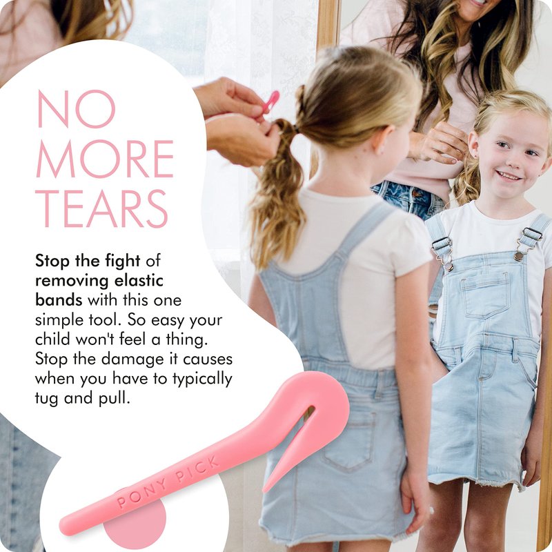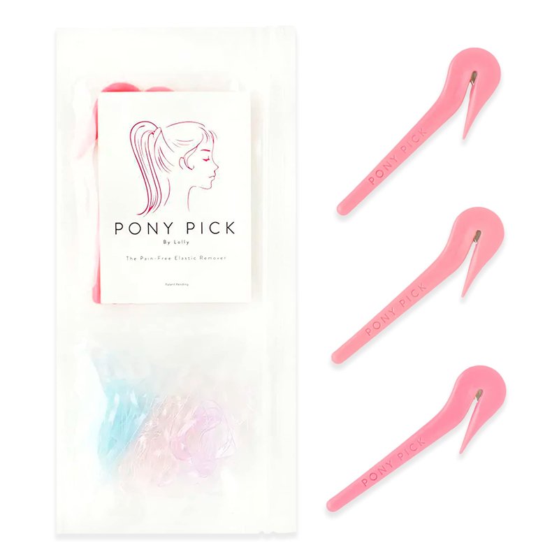 THE PONY PICK Elastic Rubber Bands Cutter for Hair - Elastic Hair Band Remover - Pain Free - Easy Removal - 3 Pack of Pink Pony Picks & 50 Colored Hair Elastics