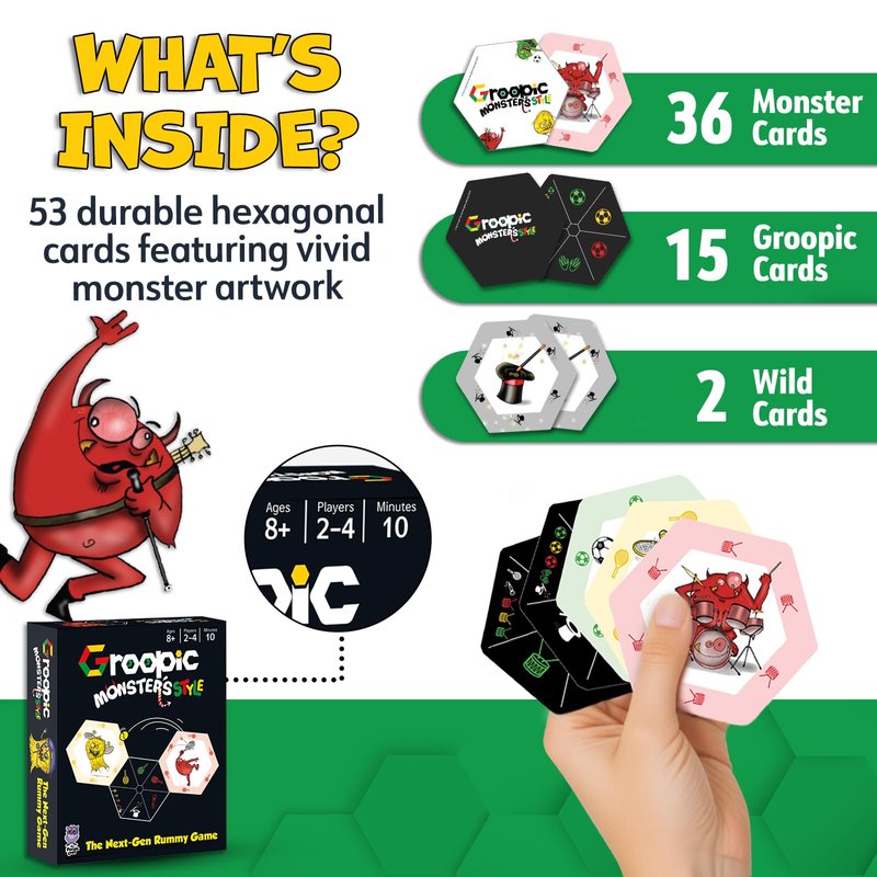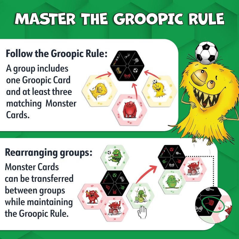 - Instead of sets and runs, players collect groups of hexagonal Monster Cards around central Groopic Cards depicting monster activity symbols. Rearrange groups strategically to be the first to get rid of all your cards!