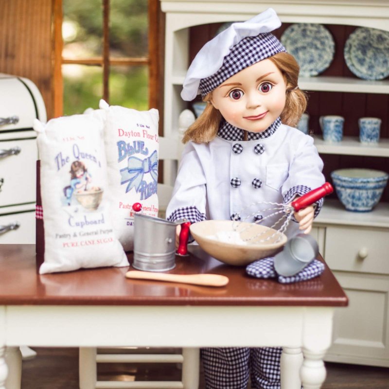 Everything 18" dolls need to play pastry chef with tools like grandma used! Collection includes an vintage flour and sugar sacks, realistic flour sifter that really turns, a tin "scoop" for the flour and sugar, a wooden dough bowl, wooden spoon and adorable whisk. Crafted in safe, sturdy materials for years of imaginative play - using real wood, tin, and fabric. Sized perfectly for 18" doll play. Perfectly sized for 18 inch dolls. Recommended for children 6+. Exclusively made by The Queen's Treasures, offering the highest quality 18 inch Doll Furniture, 18 inch Doll Clothes, 18 inch Doll Shoes & 18 inch Doll Accessories!