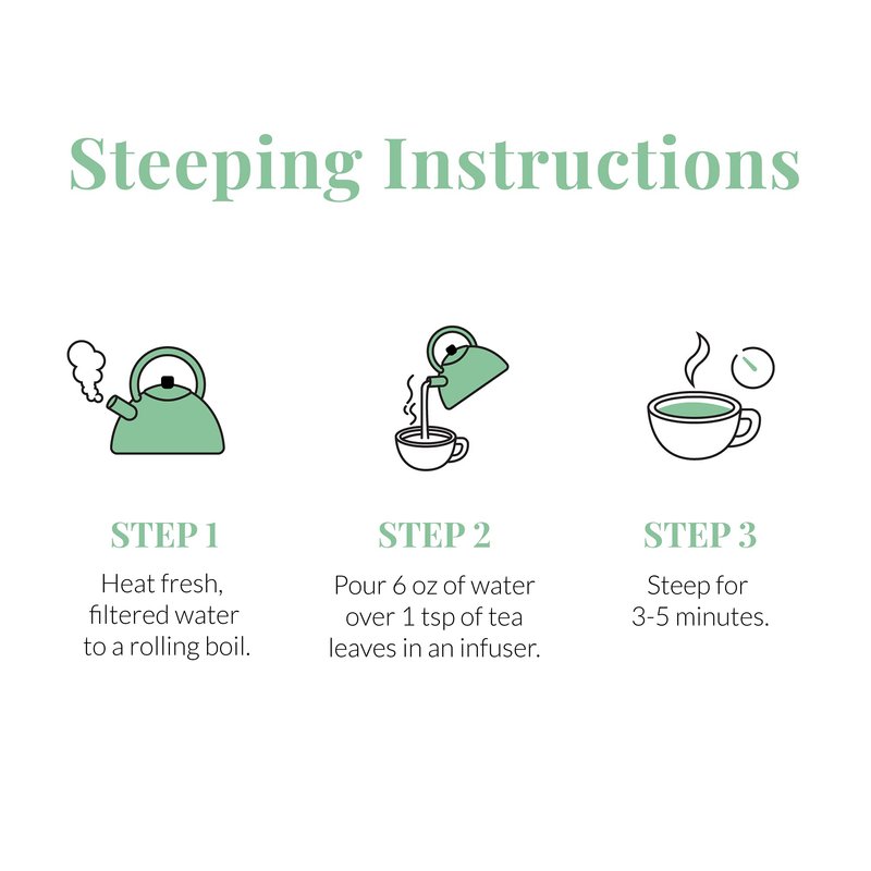 - STEEPING INSTRUCTIONS: Use 1 teaspoon of the loose-leaf tea per 6 oz of water. Steep for 3-5 minutes. For iced tea use double the amount of tea and pour over ice.