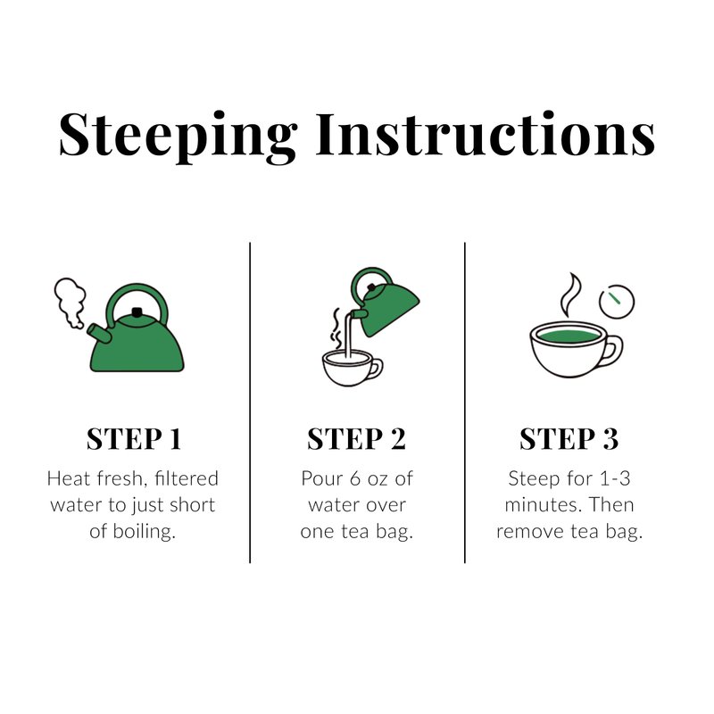 - Steeping Instructions: Simply heat fresh, filtered water to just short of boiling. Then pour 6 oz of water over a tea bag and steep for 1-3 minutes. Experiment to find your favored steeping time. Remove the tea bag and enjoy. After steeping, add the used tea bags to compost or soil — they make gardens happy.