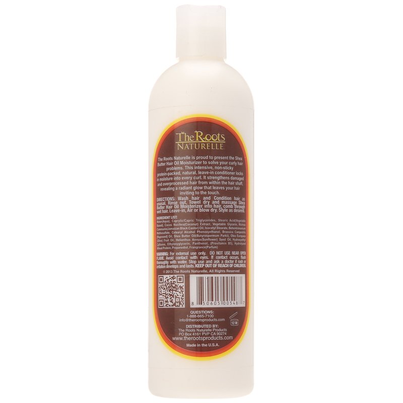 The Roots Naturelle is proud to offer this Shea Butter Hair Oil Moisturizer through Amazon to solve your curly hair challenges. This intensive, non-sticky protein-packed, natural leave-in conditioner locks in moisture to every curl. It strengthens damaged and over-processed hair from within the hair shaft, revealing a radiant glow that leaves your hair inviting to touch. Directions: Wash and condition hair as usual. Rinse out, towel dry and massage this Hair Oil Moisturizer into your hair. Comb through wet hair. Leave in, air or blow dry as desired.