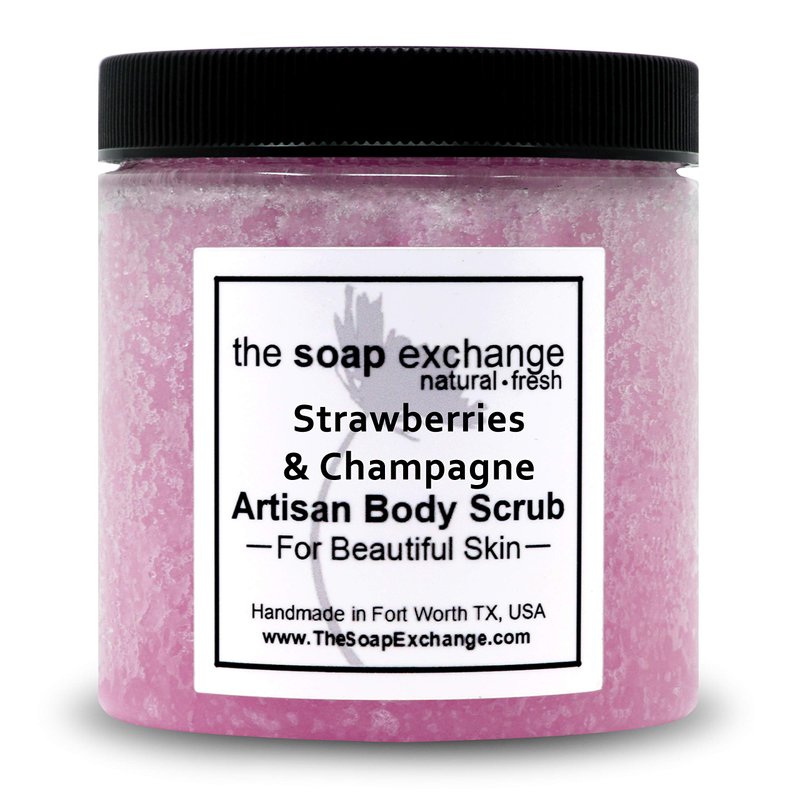 The Soap Exchange Sugar Body Scrub - Strawberries & Champagne Scent - Hand Crafted 8 fl oz / 240 ml Natural Artisan Skin Care, Shea Butter, Exfoliate, Moisturize, & Protect. Made in the USA.