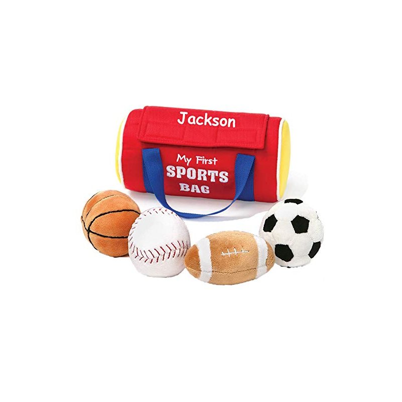 Personalized with the name of your choice on this GUND My First Sports Bag plush playset. Customization completed with embroidery on the bag flap. The perfect gift for your sporty baby! This 5 piece set includes sports bag, baseball sound toy, basketball squeak toy, soccer ball crinkle toy, and a football rattle. Bag measures approximately 8 inches long. Great for baby shower gifts, gender reveals and interactive playtime! Note: Items that are customized specifically for the customer (such as monograms, names, embroidery, vinyl transfer, etc.) are not eligible for a return. Please refer to the "Customized Products" section of the Amazon Return Policy for more info and double-check all spelling prior to submitting your order.
