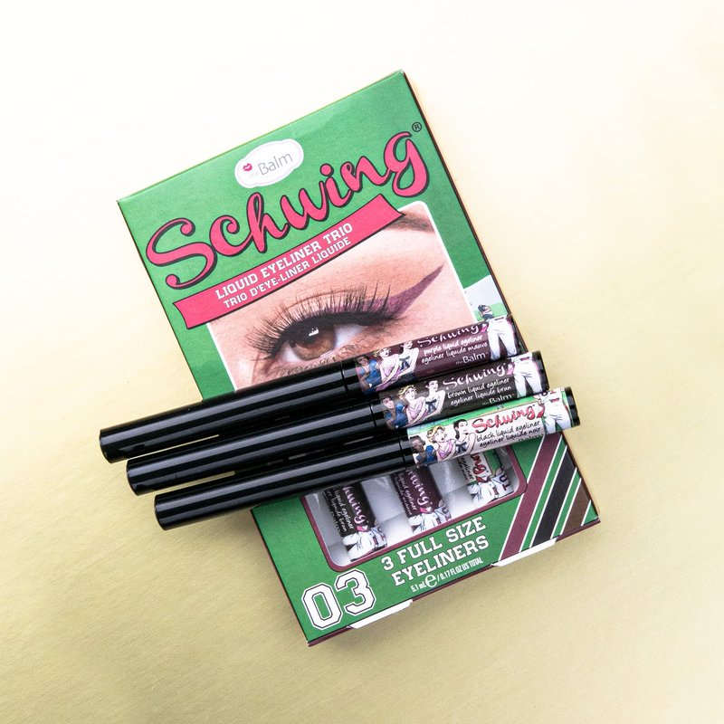 - This triple playing trio features a classic dark brown, a vivid purple with a touch of shimmer, and our best-selling matte black shade. Use the matte brown and black eyeliners to create a gorgeous (sch)winged look that emphasizes lashes. Use the purple eyeliner to create a winning, subtle accent, or layered for a more high-impact, home-run wing. Packaged to be compact and pocket-friendly, the Schwing Holiday Trio is the perfect holiday gift… Score!