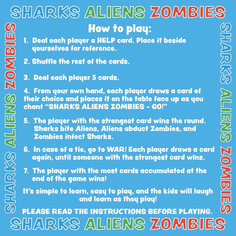 - EASY TO LEARN CARD GAME FOR KIDS BOYS-GIRLS: A great 2 Player or 3 Player card game for kids and children ages 6-12 years old who love Sharks Games Aliens Games and Zombie Games. It plays like Rock Paper Scissors but as a playing card game. A Fun Friendly simple to play and set up playing card game.