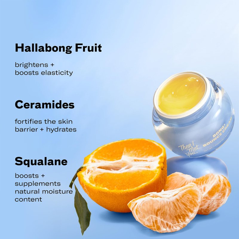 - NOURISHING NECTAR: Hallabong are known as the “Honey coated orange”. We formulated Bong² Bounce Cream with honey extract because it draws moisture from the air and binds it to the skin. The humectant properties impart lightweight but long lasting hydration to achieve ‘honey skin” results – dewy skin that's deeply plumped with nourishment