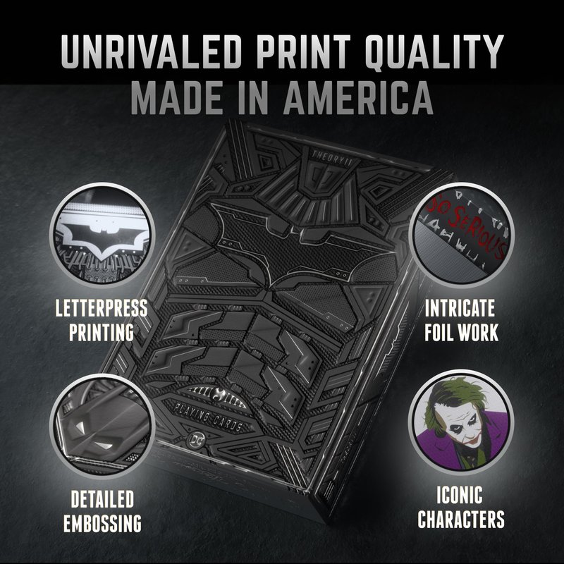 - 3D PRINTED BOX. Premium playing cards printed with 3D sculptured embossing, silver foil, and tons of intricate details. A silent guardian. A watchful protector. The Dark Knight. Relive the most iconic moments from the trilogy every time the cards are brought out for play - featuring fan-favorite easter eggs and callbacks to the films that would stand out to the biggest fans of The Dark Knight Trilogy.