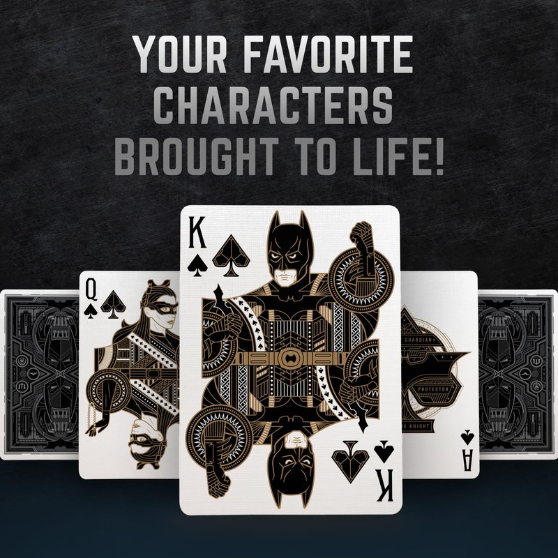 - NO DETAIL OVERLOOKED. Every aspect of The Dark Knight Trilogy Playing Cards was made from scratch: including custom suits, character designs, aces, the back design, and everything in between! If you look closely, you’ll notice several easter eggs that will satisfy even the biggest fan.