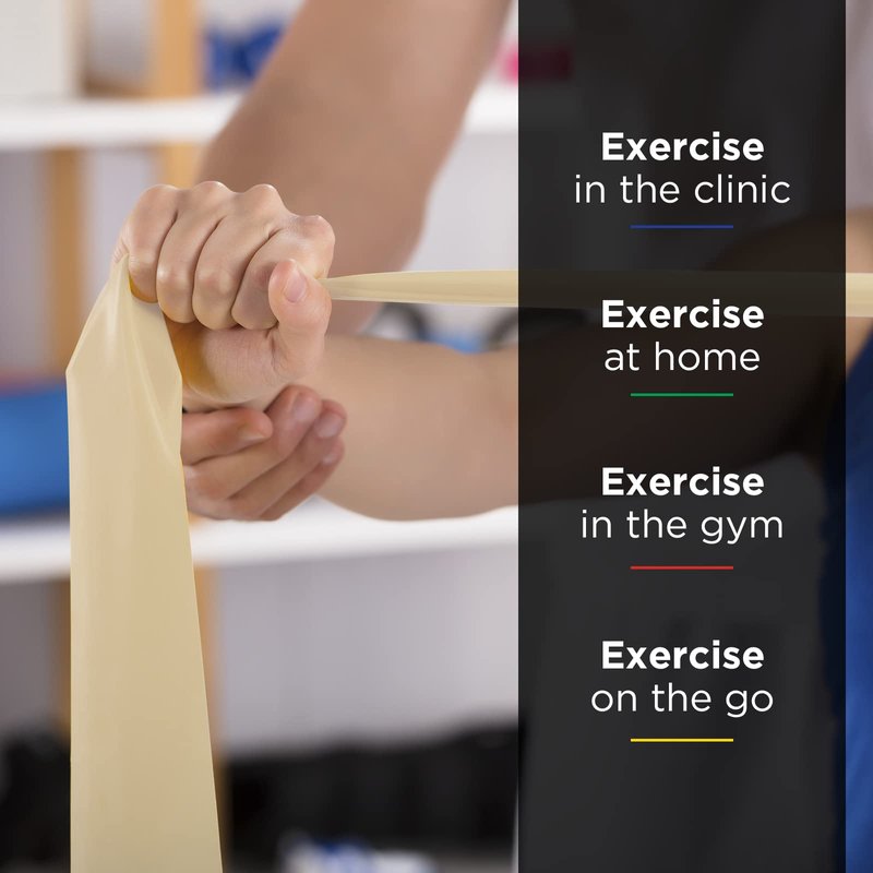 - Extra Thin, Tan Bands are the first of eight levels of resistance and are great for rehabilitation or those beginning an exercise program, they offer 2.4 lbs. resistance at 100% elongation and 3.4 lbs. at 200%, roll measures 50 yards long x 5" wide