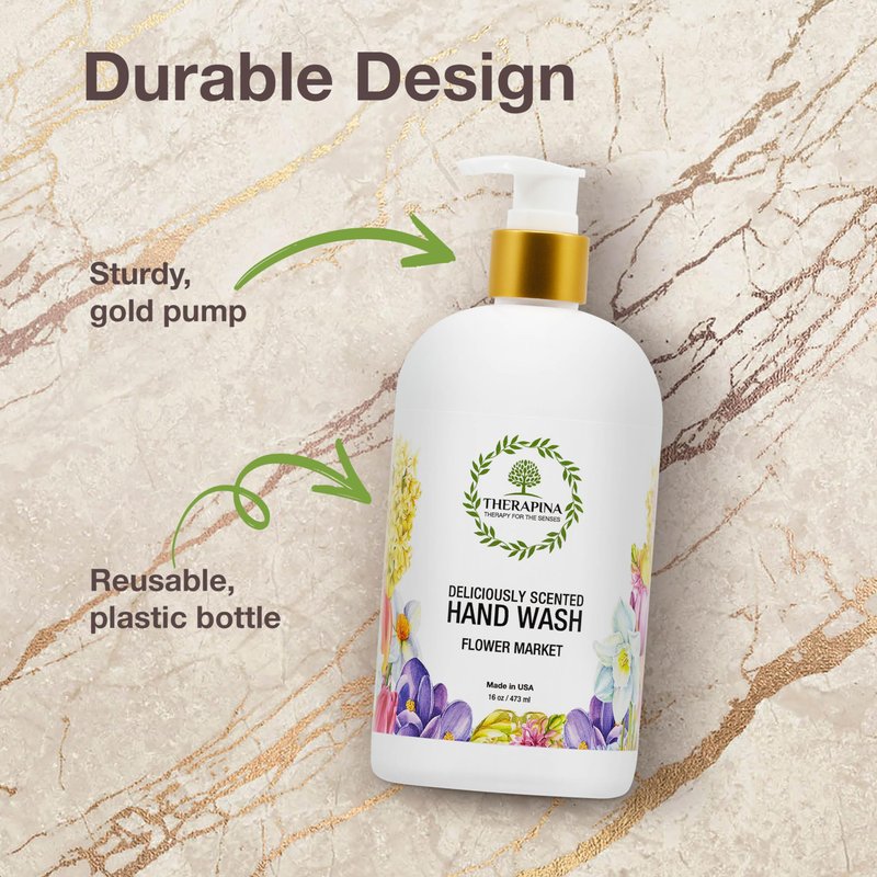 THERAPINA Aromatherapy Luxury Liquid Hand Soap – Vegan, Moisturizing Hand Wash with Aloe Vera, Botanical Oils, Flower Market Scent – Fancy Liquid Hand Soap for Bathrooms, Kitchen, More, 16 Oz.