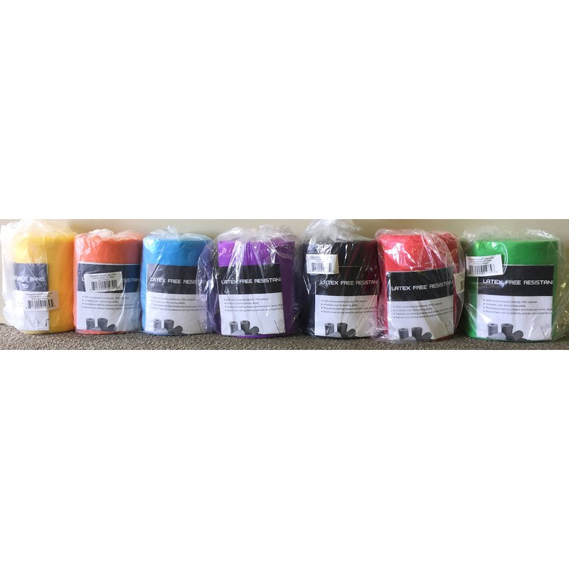 Therapist's Choice Latex-Free 25 Yard (75 Feet) Bulk Roll Resistance Bands. 6" Width Band Finally, Individually packaged in a plastic bag 25 yards long, 6” wide bands. (Extra Light 2 to 4 LBS Resistance = COLOR YELLOW) (Light 4-6 LBS Resistance = COLOR ORANGE) (Medium 8-10 LBS Resistance = COLOR BLUE) (Heavy 10-12 LBS Resistance = COLOR PURPLE) (1X-Heavy 12-15 LBS Resistance = COLOR BLACK) (2X-Heavy 15-18 LBS Resistance = COLOR RED) (3X-Heavy 18-20 LBS Resistance = COLOR GREEN). Made from TPE (Thermoplastic Elastomer)