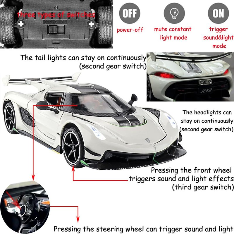 - Three switch modes at the bottom of the car. Power off mode, mute light mode, and sound & light triggered mode.