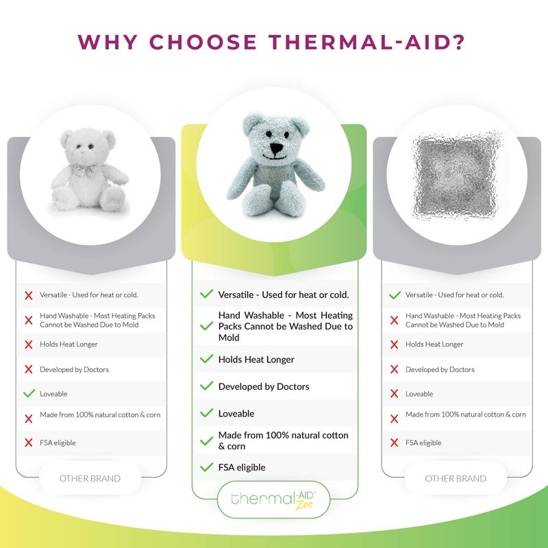 When your little one needs quick relief, Thermal-Aid Zoo Mini’s have got you covered. These compact yet powerful therapeutic stuffed animals offer both hot and cold treatments in an adorably small package. Whether it's in the car, at school, or during a family outing, these Mini’s are ready to provide comfort and relief on the go. Made from a cotton blend and a corn-based heating and cooling element, each mini animal is an effective solution for a variety of common childhood ailments. Easy to wash and built to last, Thermal-Aid Zoo Mini’s make every boo-boo better. Trust Thermal-Aid for convenient and loving care, anytime, anywhere.
