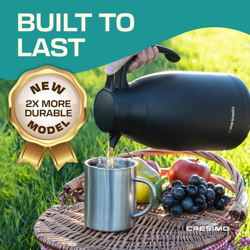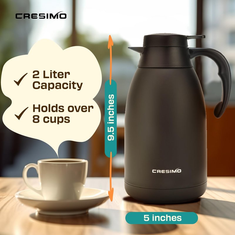 Enjoy Your Coffee the Way You Like It! Nothing makes it easier to wake up in those early mornings, than having fresh, aromatic, and piping hot coffee ready to drink! With our premium Cresimo Coffee Server and hot water urn, you can enjoy hot drinks anytime and anywhere. The vacuum insulation technology locks in the temperature and preserves the flavors you love and the freshness you need! The durable double-walled 18/8 stainless steel interior and exterior was crafted with style and functionality in mind - keeping your kitchen sleek and your beverages hot for 12 hours and cold for 24!! For best results, preheat your thermos for hot drinks by adding hot boiling water inside for 15 minutes and then dumping it out, before adding your hot beverage. Not only will this premium coffee thermos keep your beverages hot for 12 hours, but the outer body stays cool to the touch when filled with hot liquids! Plus, the exterior remains condensation-free when filling it with cold beverages. This large 68 ounce size holds up to 2 Liters of Coffee. Perfect for serving fresh, hot coffee throughout the day in your home, office, or on the go. This insulated carafe is also great for hosting events - weekend brunch, holiday parties with a hot chocolate station, book club get togethers, and so much more. This is a must have kitchen accessory for coffee lovers. Upgrade your coffee experience today with your very own Cresimo Coffee Carafe