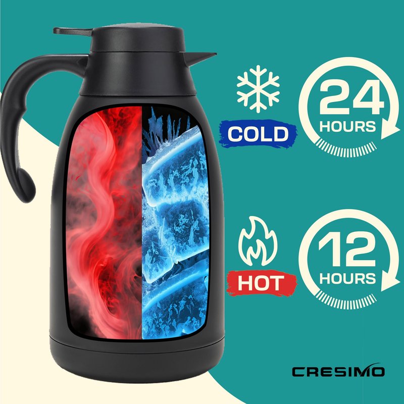 - HOT OR COLD TEA THERMOS » Cresimo's lab- tested vacuum insulation technology locks in temperature for 12 hours hot or 24 hours cold. Your new coffee carafes for keeping hot will stay hot. Hint: It's also a great hot chocolate dispenser!