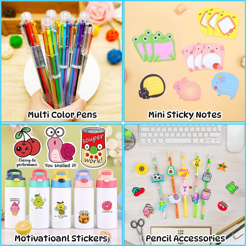 - 168PCS Goodie Bags Stuffers for Kids - This stationery party favors kit includes 5 multi color ballpoint pens, 12 pencils, 10 pencils sharpeners, 8 mini animal sticky notes, 5 rulers, 12 scratch bookmarks, 12 stamps, 50 motivational stickers, 10 pencil toppers, 10 pencil accessories, 10 erasers, 2 pack 12-colored pencils.