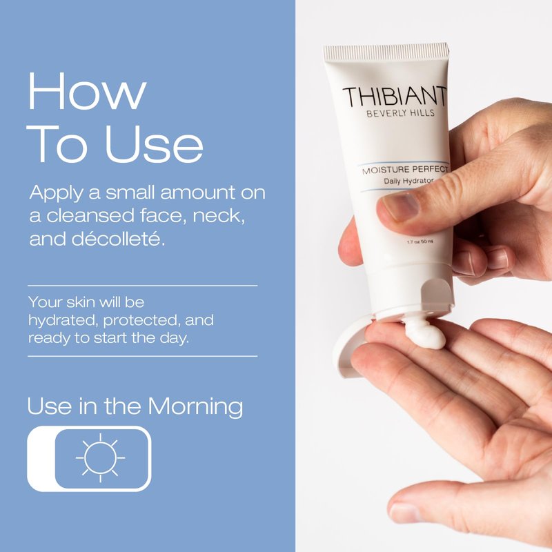 Moisture Perfect by Thibiant Beverly Hills provides intense hydration and collagen support. Loaded with a blend of classic and innovative ingredients such as Vitamins C and E, Matrixyl and Aquaxyl, our skin moisturizer for face helps reduce the appearance on fine lines and wrinkles while supporting firmness and moisturization. Your skill will be hydrated and ready to start the day. Ideal for all skin types. Use in the morning. Apply a small amount on a cleansed face, neck, and decollete. Our day cream formula is free of parabens and sulfates and is not tested on animals.