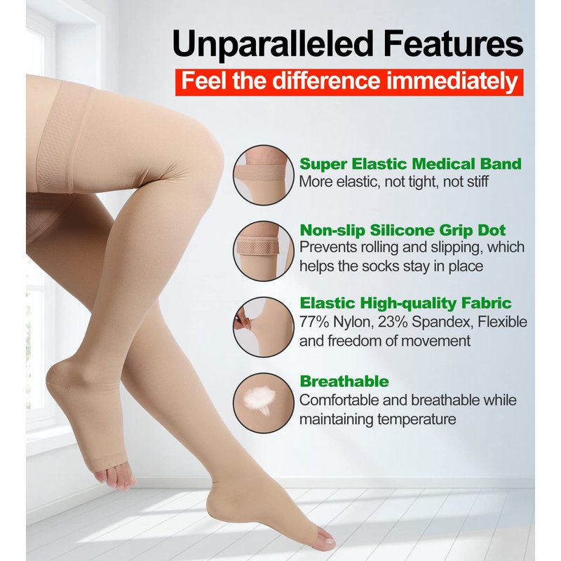 - ✅【All Day Comfort】- Silicone grip dot-top lining prevents rolling and slipping, which helps the thigh high support socks stay in place throughout the day; High-quality medical fabrics - 77% Nylon, 23% Spandex - air-covered spandex thicker yarn soft touch, comfortable all day wear. Toeless design for inspection, increased comfort, and sandal footwear; Moderate support, unisex thigh highs, Doctor-recommended, MGANG 20-30 mmHg graduated compression thigh high support stockings!