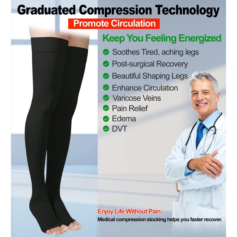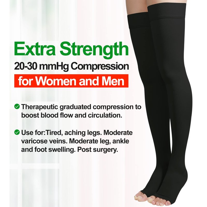MGANG thigh high compression stockings provide firm 20-30mmHg graduated pressure to encourage fluid flow in your circulatory and lymphatic system. These compression stockings offer a classic fit all while providing the benefits of medical-grade compression. MGANG Medical compression stockings help prevent swelling, edema fluid retention, DVT vein clots, pooling of blood, you will notice the change if you wear these a few hours each day. All-day Comfort - These thigh high compression stockings are made with soft spandex yarn which makes them comfortable for all day wear. Dot Top - They have a wide, comfortable silicone top band that stays in place and makes it easy to put on. Knit-In Heel - Defined, Reinforced heel pocket increases durability and sock orientation to achieve ergonomic fit. Comfort Toe - Toeless design for inspection, increased comfort, and sandal footwear. Graduated compression technology is greatest at the ankle and decreases gradually up the leg to promote healthy circulation and keep you feeling energized. Proven Effective: Enhance blood cycling, Relieves varicose veins, Reduce foot swelling, Relieve muscle fatigue and soreness. Prevent edema fluid retention. Post-surgical recovery, and athletic recovery. Pregnant woman, nurses, and doctors, Masseurs, cosmetologists, and stylists. Frequent travelers or anyone taking a long plane flight, Office worker, long time wear high heel shoes persons. Choose the Perfect Fit Compression Stockings for You to Have a Healthy Life!MGANG 20-30 medical compression stockings thigh high compression hose for women men thigh high compression socks women 20-30 mmhg open toe support socks for women compression 20-30 Thigh high leg sleeves Thigh High Compression Sleeves over the knee compression socks for women medias de compresion para varices medias de compresion para mujer compression socks for women 20-30 mmhg knee high medical compression tights medical compression leggings for women men