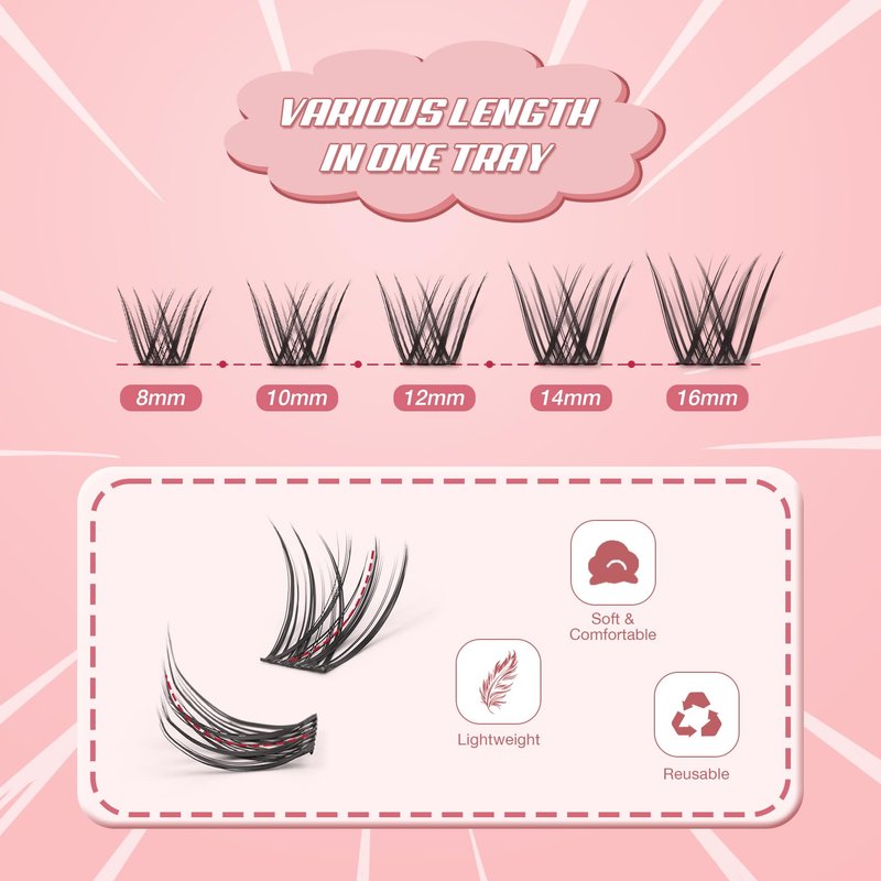 - Versatile Cluster Set: All-in-one with 336 clusters, offering a range of styles, and a mix of lengths from 8-16mm. Individual lengths include 8mm, 10mm, 12mm, 14mm, and 16mm. Achieve a stunning eye makeup look with every 4-6 clusters.