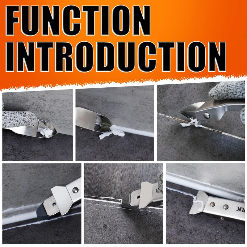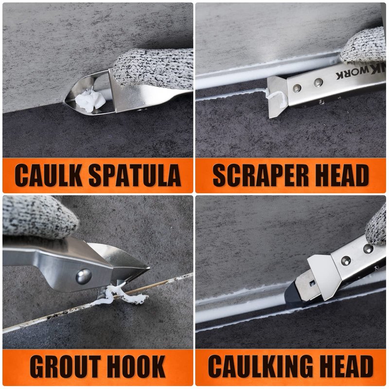 - New design and upgraded : This stainless steel caulking tool is designed as a 4-in-1 tool, made entirely of stainless steel which is highly durable. It also has a newly upgraded stainless steel handle that is less prone to breaking.