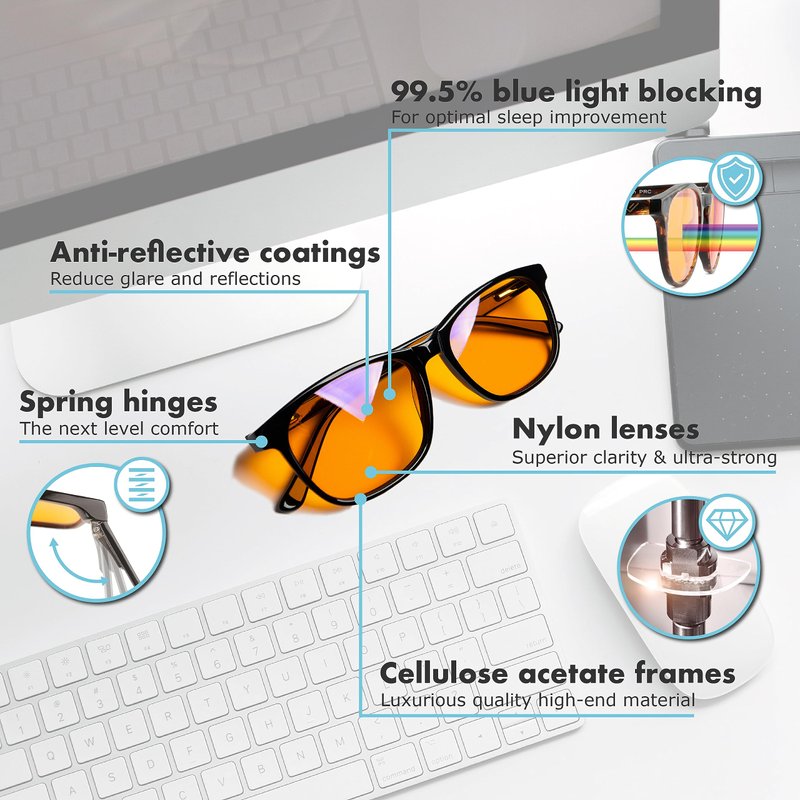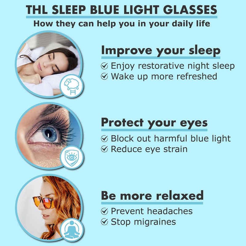 - Unlock better sleep with premium orange blue light blocking glasses from Thl Sleep; Wear the orange blue light glasses at night to stop digital eye strain or headaches as orange migraine glasses