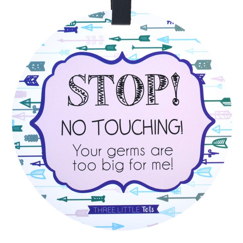 THREE LITTLE TOTS – Blue Arrow Modern Stop No Touching Baby Car Seat Sign or Stroller Tag - CPSIA Safety Tested