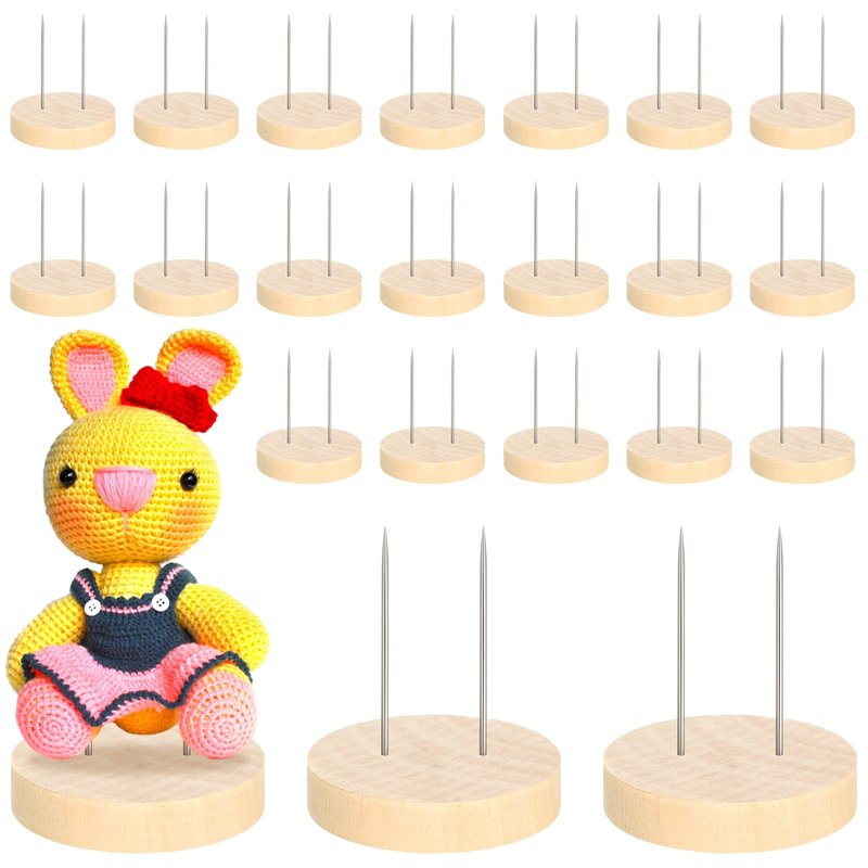 Threehoney 24 Pcs Crochet Doll Stand Wooden Knitted Doll Display Stand Double Steel Needle Doll Holder Felting Animal Doll Toy Wooden Base Support Action Figure Stand