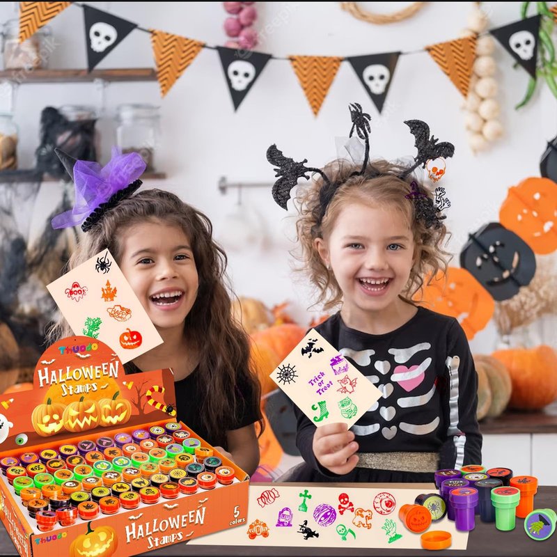 - The halloween stamps are mixed designs that are featured in the set. This kids stamps comes as well in assorted vibrant colors that kids can enjoy. No need to fill inks as each plastic stamp comes pre-inked.