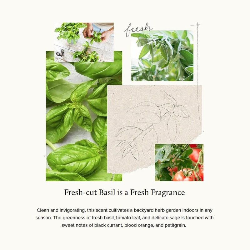 - Fresh-Cut Basil - Clean and invigorating, this scent cultivates a backyard herb garden indoors in any season. The greenness of fresh basil, tomato leaf, and delicate sage is touched with sweet notes of black currant, blood orange, and petitgrain.